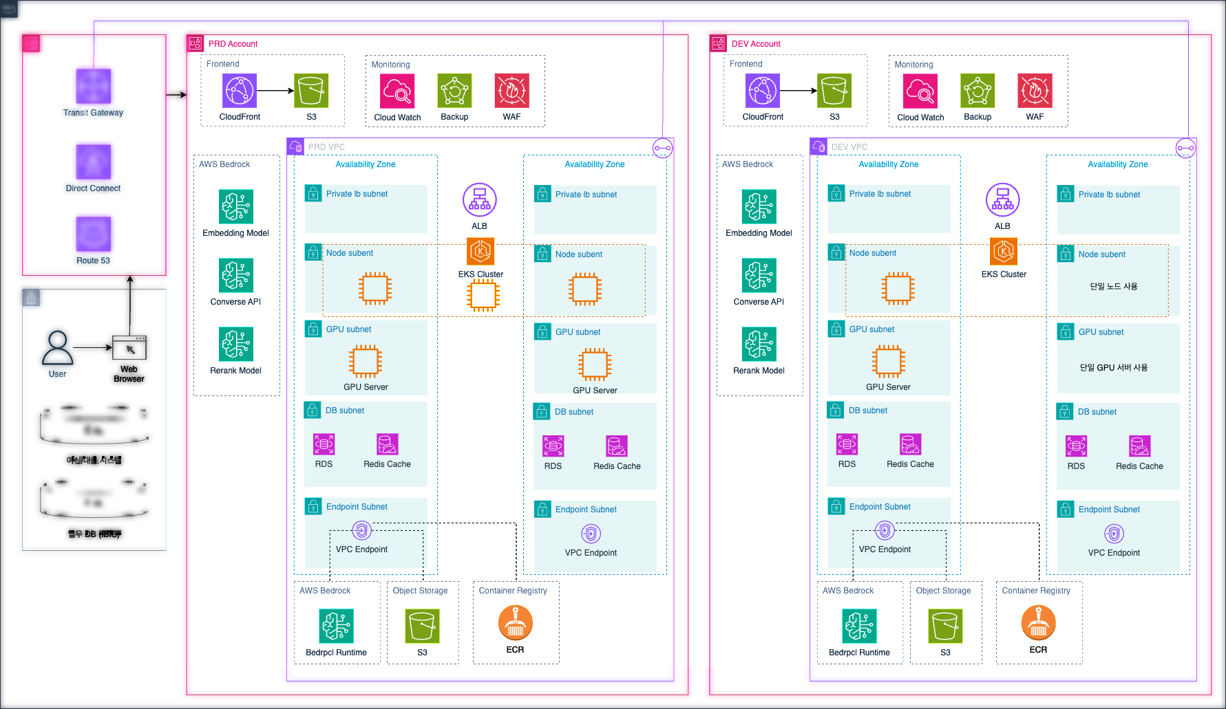 - DEV Account: 개발/테스트 환경으로 비용 최적화를 위한 단일 노드/GPU 서버 구성